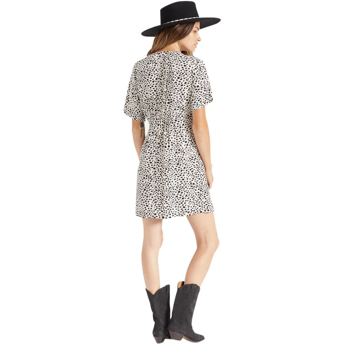 A custom cheetah print decorates the Cheetah Dress from shoulder to hem. Made with flowing viscose satin, it’s breathable and buoyant. Layer it over tights for cooler weather or pack it in your suitcase for trips down south. Short sleeves and a shirred elastic waist.