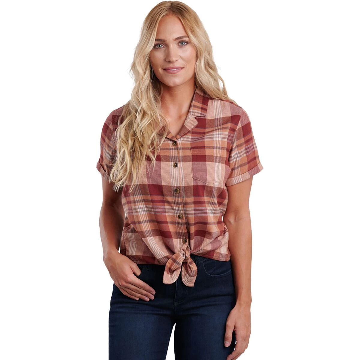 When summer weather calls for a sunny picnic we rock the KUHL Elsie Short-Sleeve Shirt. The cotton blend provides breathable moisture control in the sun, while the tie-front design offers a look that is at home when you meet your friends down town afterward.