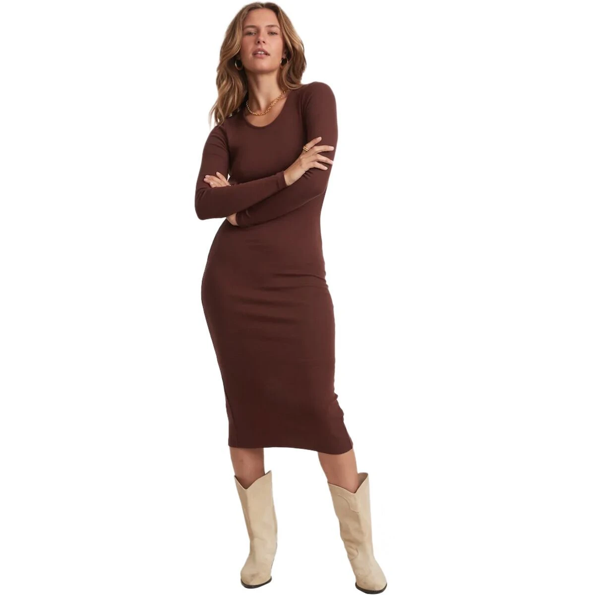 For easy-wear style that hugs our curves in all the right place, we slip into the Marine Layer Lexi Rib Long-Sleeve Midi Dress and let the ribbed double-layer construction do its thing.