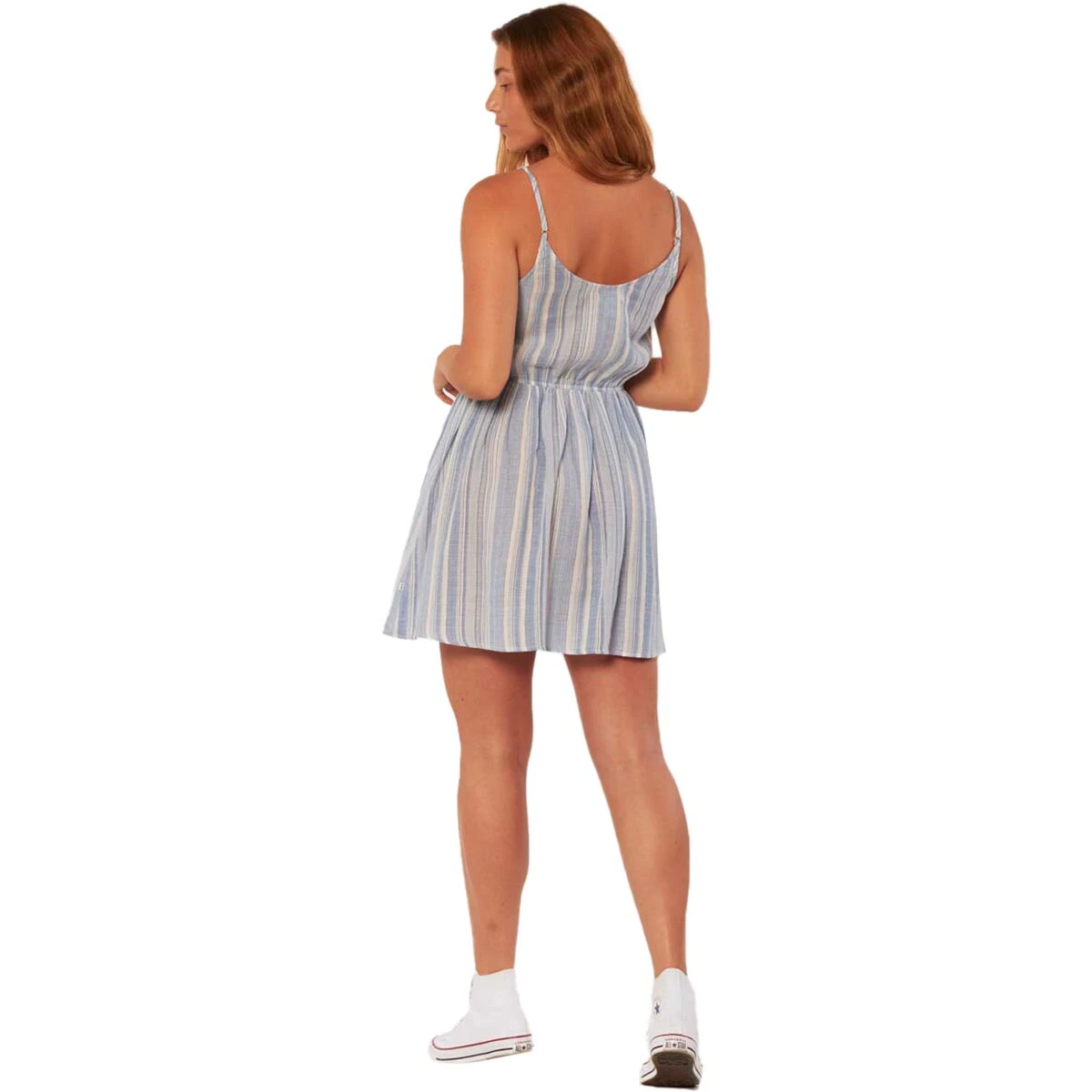 Pleasant as the Ocean Breeze . . . A light yarn dyed stripe mini dress with adjustable spaghetti straps, featuring a front placket with buttons. It just might blow you away.